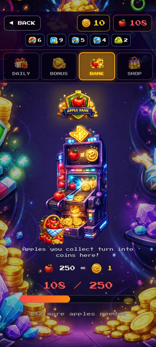 7-day login rewards, bonus wheel, apple-to-coin exchange, and power-up shop